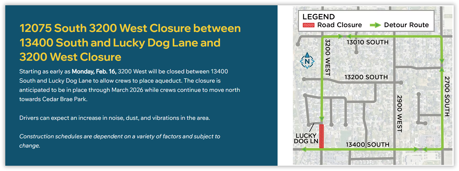 Southwest Aqueduct Reach 2 construction will begin on 16 Feb and go through 13 Mar. Partial road closures will be in effect during these days which may make getting to the Stake Center difficult and/or take more time.